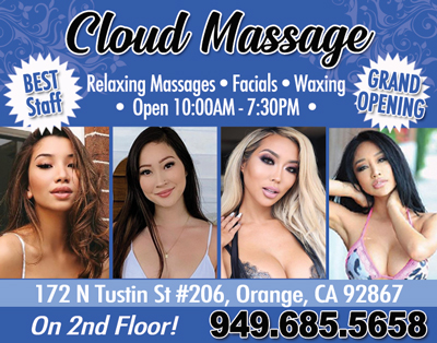 Cloud Massage Gentlemen's Guide Staff Off Massage & Spa, Massage & Spa Listings, Men's Spas, Therapeutic Massage, Welcome To Cloud Massage * * Grand Opening * * Best Friendly Asian Staff * * Relaxing Body Massages • Facials • Waxing Open 10 AM – 7:30 PM Daily * Located On 2nd Floor 172 N Tustin St #206, Orange, CA 92867 * * Call 949-685-5658 Tags: gentlemens guide massages, gentlemens guide oc, massages for men, massages in oc, massages in orange, massages in orange county, oc massages, orange massage, orange massages Previous: PCH Therapy Related posts PCH Therapy Welcome To PCH Therapy * * Grand Opening * * Nice Friendly Asian Staff * * Relaxing Body Massages • Facials • Waxing Open 10... OC Wellness Center Welcome To OC Wellness Center * * GRAND OPENING!! * Men's Relaxation * BEAUTIFUL & SEXY LATINAS! * * Infrared Sauna • Massages • Table...